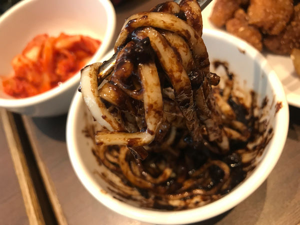 店家特地選用 3mm 扁麵,麵條Q彈有勁,再淋上黑亮韓式炸醬
