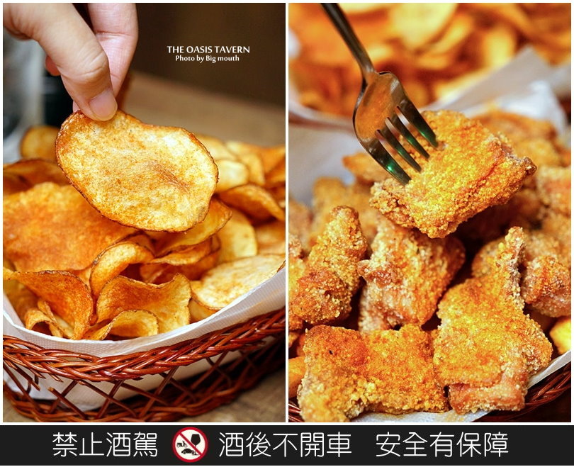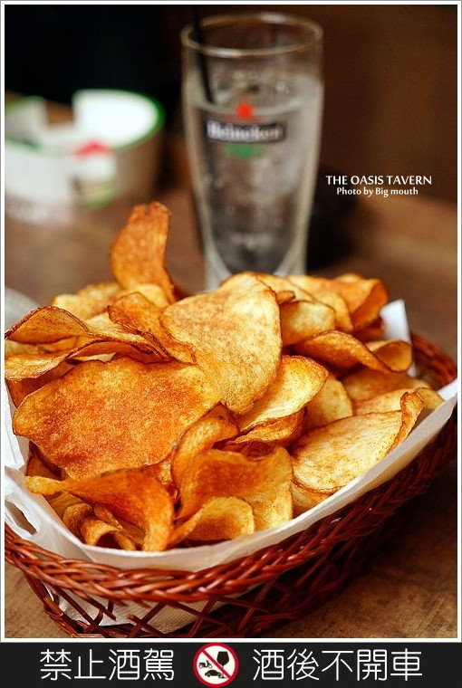 ▼竹籃炸雞是採用雞腿排下去醃漬後香炸而成,底層還鋪有炸薯條,份量還不少,足夠我們兩個人飽餐一頓了!另外手工洋芋片也是採用整顆馬鈴薯下去現切現炸,也是下酒良伴唷!