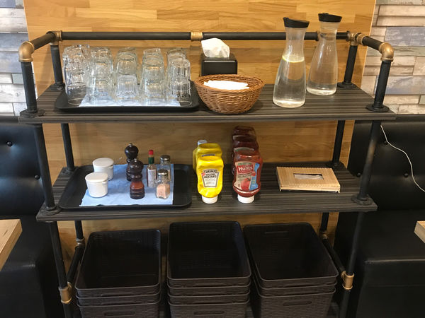 座位區旁就有小小的自理櫃,開水、餐巾紙、調味用品都可以自行取用,最下面一層的小籃子是給我們拿到座位上可以放包包的籃子喔~