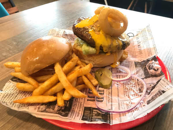 牛肉漢堡加上有顆粒的花生醬,再淋上香濃起司,配上現炸酥脆洋蔥圈