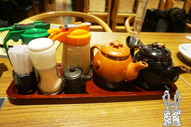 有辣跟不辣的豬排醬 玫瑰鹽 以及用於高麗菜的紫蘇醬跟芝麻醬