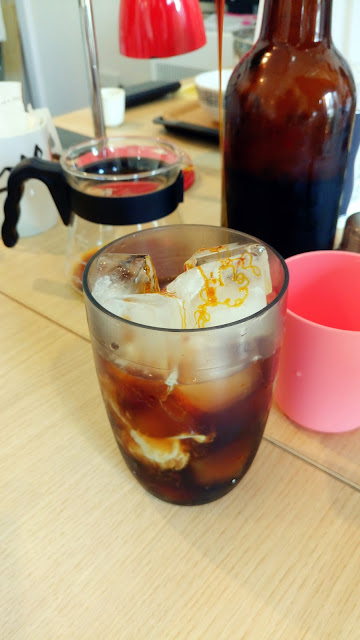 然後老闆順便製作焦糖冰咖啡請我們喝,喝下時帶有巧克力香的咖啡味,有點像是提拉米蘇,不甜,但是喝完後有焦糖香味回韻。