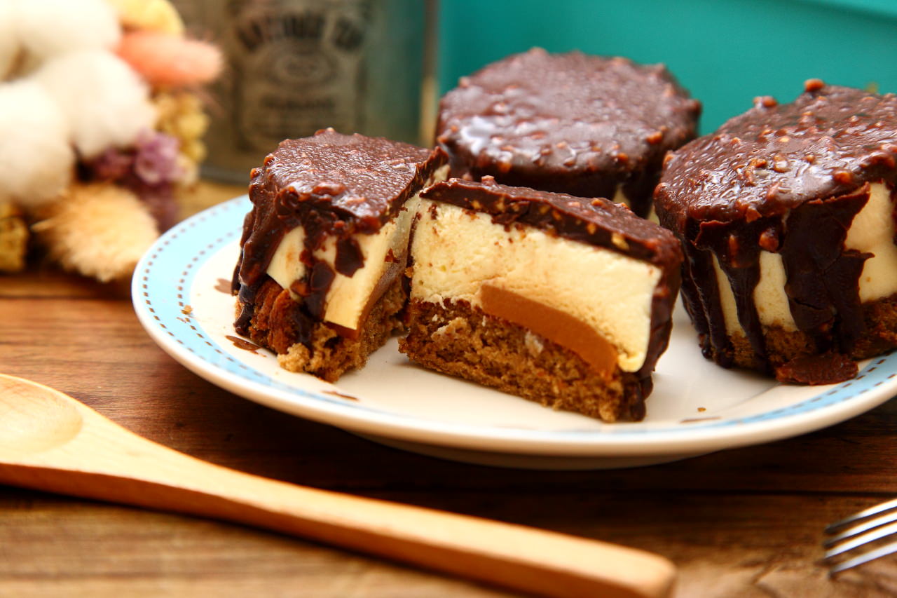 切開脆皮提拉米蘇,外表不一,裡面更不簡單!最外層是脆皮杏仁巧克力、中間夾著提拉米蘇及焦糖庫利,最底層是咖啡海綿蛋糕,造型小巧可愛,咬咬一次可以塞一個在嘴裡,外層的巧克力甜香帶著核果香,中間的提拉米蘇相當細滑柔軟,加上甘美的焦糖庫利,如雪糕般的口感入口即化,甜而不膩香氣十足,咬咬不愛吃甜點都能一口氣連吃三個.看這提拉米蘇有多好吃就好!
