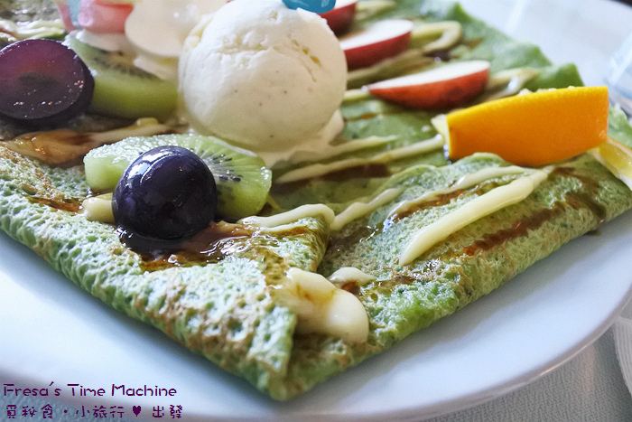 黑蜜抹茶可麗餅有一球香草冰淇淋、葡萄、蘋果、奇異果、柳橙、棉花糖.