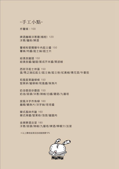 每人低消80元.餐點須加收1成服務費.提供WIFI使用.