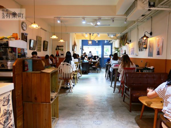 一眼望過去,店內空間屬於長形的配置,位置不算少,靠窗的高腳椅,兩人桌與沙發座,桌型的配置也很多元卻不零亂的溫馨感。木質桌椅帶有復古鄉村風情,店內擺設眾多卻不紛亂。牆上除了有許多裝飾品,也運用不同色彩的來妝點牆面。在昏黃燈光的照映下,整家店顯得更優雅呀。