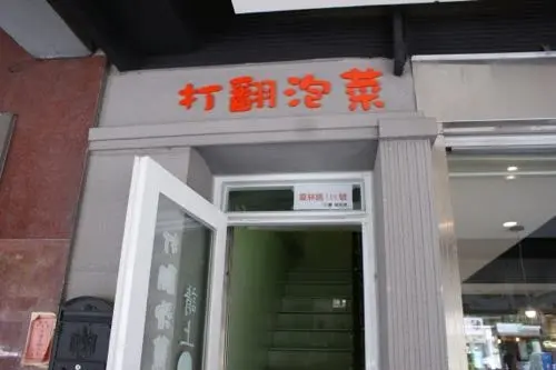 騎樓有個樓梯通往樓上,外面放有打翻泡菜的展示黑板,雖然不顯眼但還算好找!