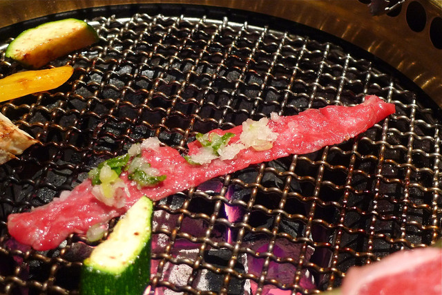燒烤肉片因為最薄,所以要小心控制熟度,包著蔥花一起吃也是下飯的一品