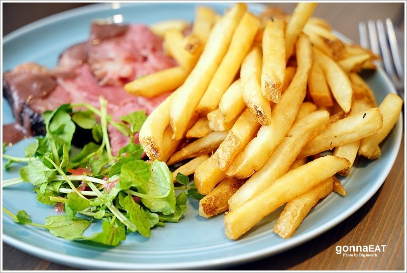 ▼舒肥烤安格斯自然牛(prime級翼板牛排8oz),採用安格斯自然飼養牛,特別選用油花分布均勻、沒有太多筋夾雜的翼板部位,經過24小時的真空低溫烹調,所以不是一般常見的香煎牛排,而是類似飯店吃到飽提供的烤牛肉唷!一旁搭配的是寬版帶皮薯條,份量還不小!如果胃口較小的朋友也可以選擇4oz的份量,就能吃得飽又吃得好!