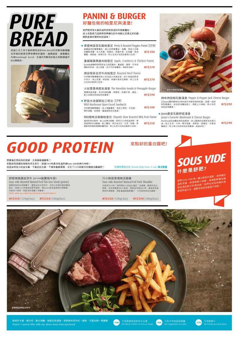 「gonnaEAT共樂遊」不僅環境明亮又時尚,搭配旅行及生活風格的實體空間,讓人心情不由得放鬆起來!餐點有早午餐、沙拉、義大利麵、肉品、漢堡、帕尼尼、點心、飲品、甜點等,選擇還不少,重點是口味都有一定的水準,不僅能讓人吃到好菜、好肉,還有天然的蔬果汁可以享用,真是太幸福了!店家從食材到醬料都非常講究,盡量不使用加工製品,就是希望大家能吃得健康又安心~也為生活開啟新的想像與美好!推薦給大家,有興趣的朋友不妨可以來品嚐看看,或許也會跟大口一樣一吃就愛上!