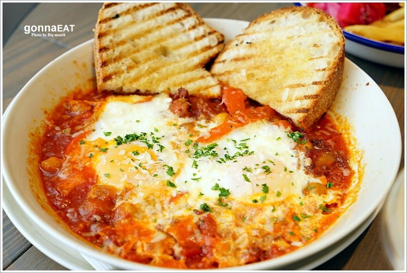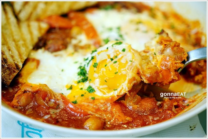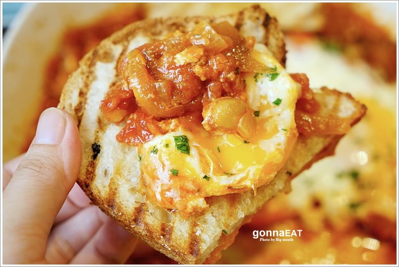 ▼巴斯克風味半熟蛋佐酸種麵包,採用西班牙香腸、鷹嘴豆、烤甜椒和大蒜融在番茄醬汁入味後,再加上兩顆半生熟的無毒機蛋,最後再灑上帕瑪森乳酪、烤酸麵包片,一上桌便聞到濃濃的香氣!