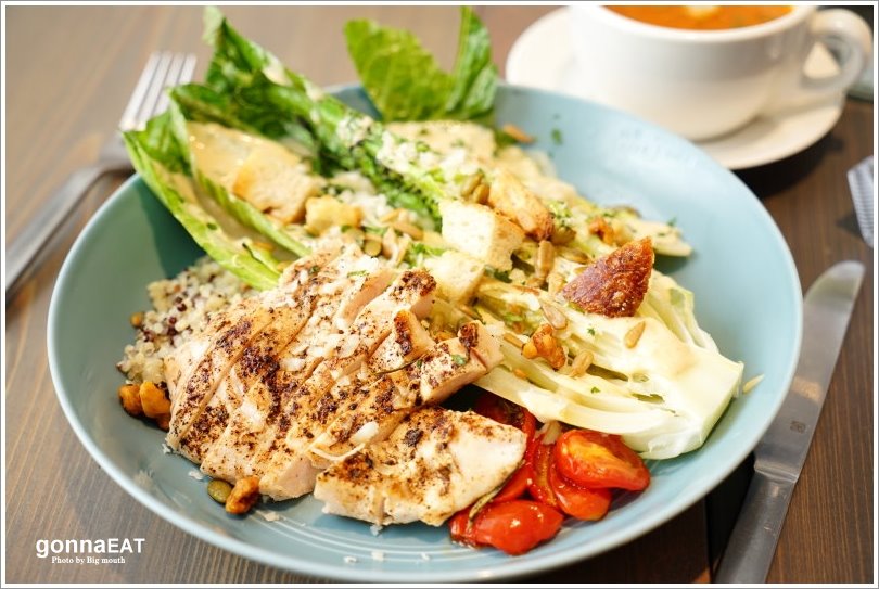▼舒肥雞肉炙烤凱薩沙拉,超大的炙烤羅曼心搭配低溫烹調的舒肥雞肉、綜合藜麥、風乾小番茄等,再搭配自製凱薩沙拉醬、烤堅果、麵包丁、帕瑪森乳酪跟新鮮香草等配料,看起來豐盛又美味!