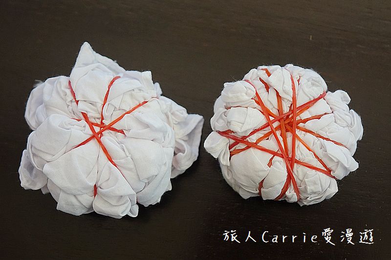 接著將布透過摺或綁來設計圖案,綁緊的地方就會留白,
