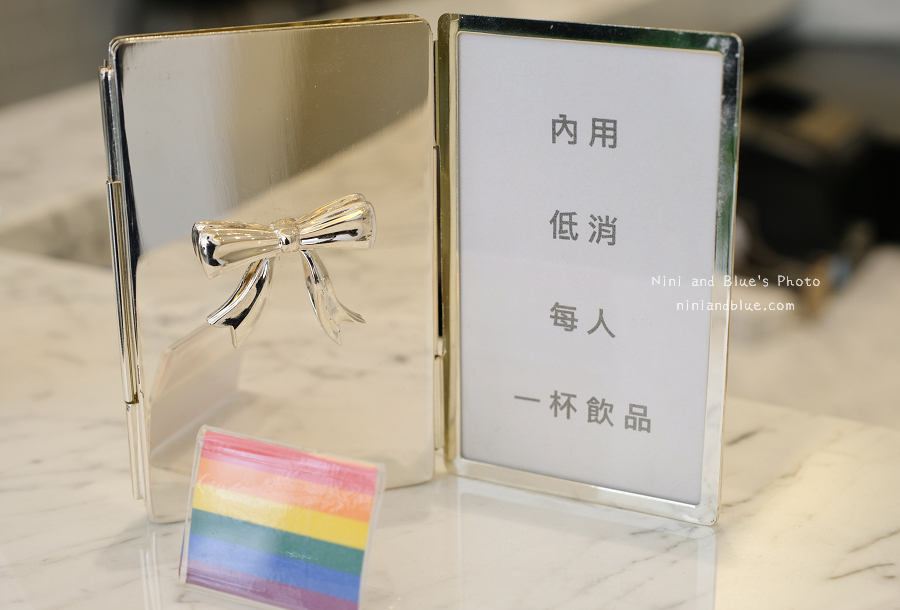 前陣子台中很夯的鏡面甜點店,以華麗的大理石紋路與亮面質感、鏡面反射感的可愛甜點取勝。空間也以大理石桌面與白色磁磚牆面裝飾,搭配金黃華麗的燈罩與器具,座位不多,而且是高腳椅,不適合久坐聊天。店內低消以每人一杯飲料為計,而非總價也不可用甜點取代。