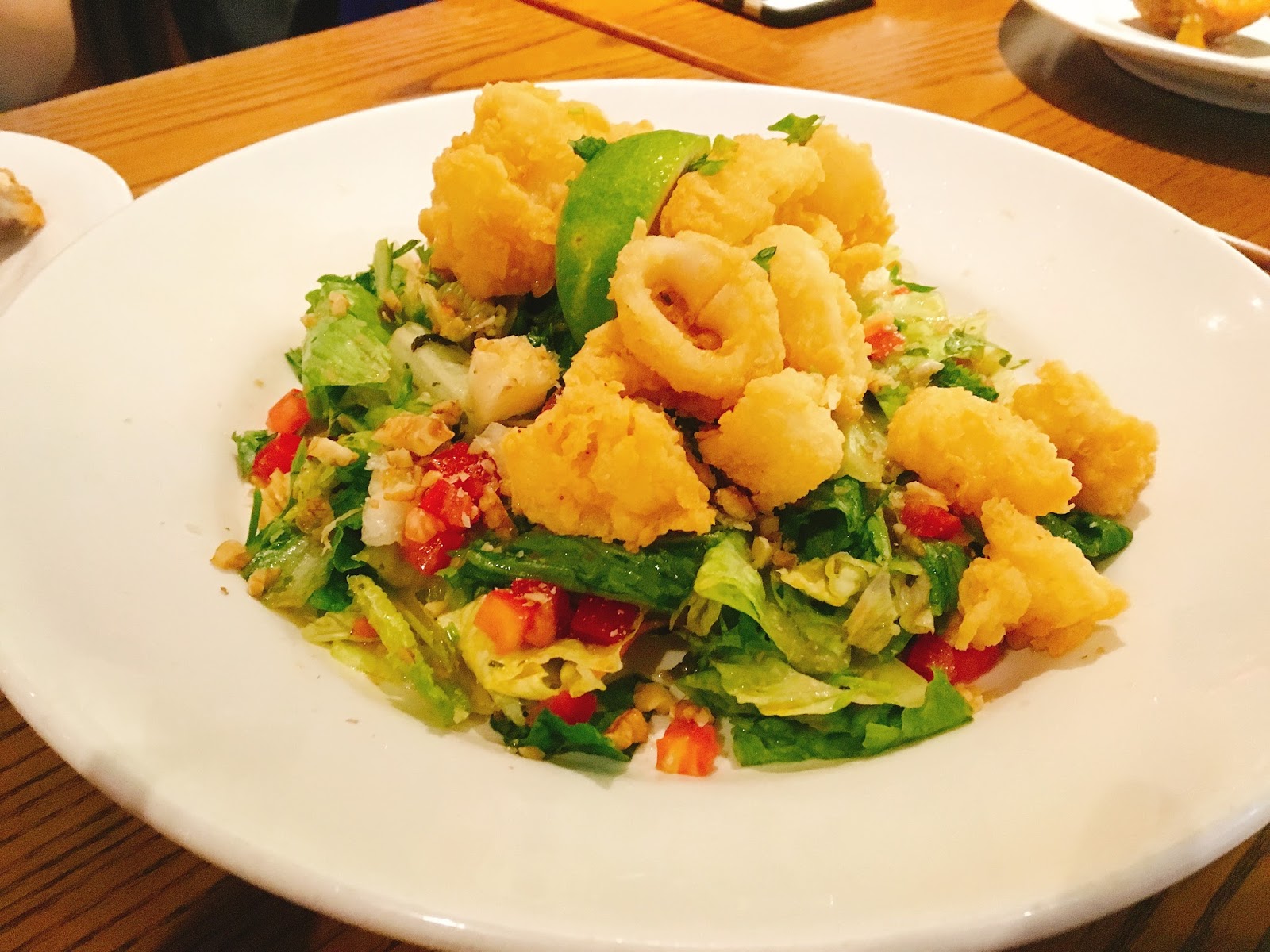 金黃酥脆的小管圈味道很不錯,搭配生菜與薄荷葉,拌萊姆香菜醬,口感其實很舒爽,也不會吃起來很油膩的口感,我個人很推薦這一道莎拉。