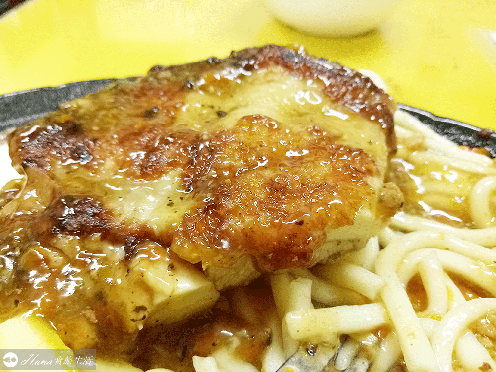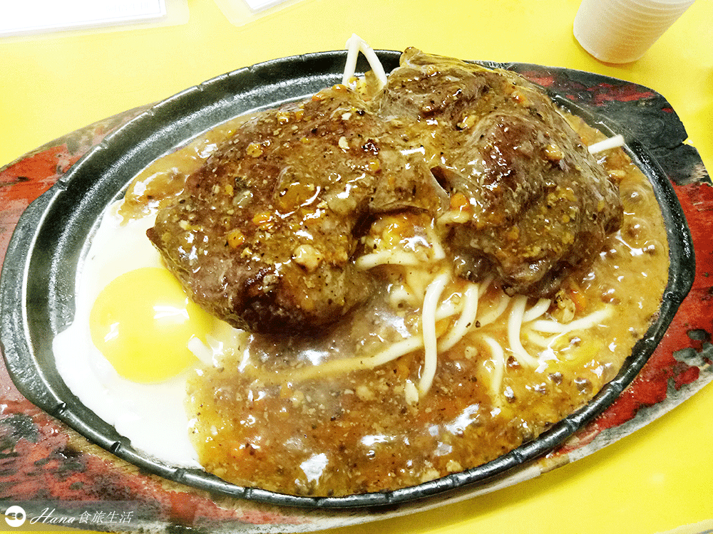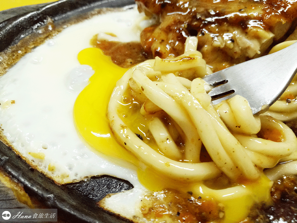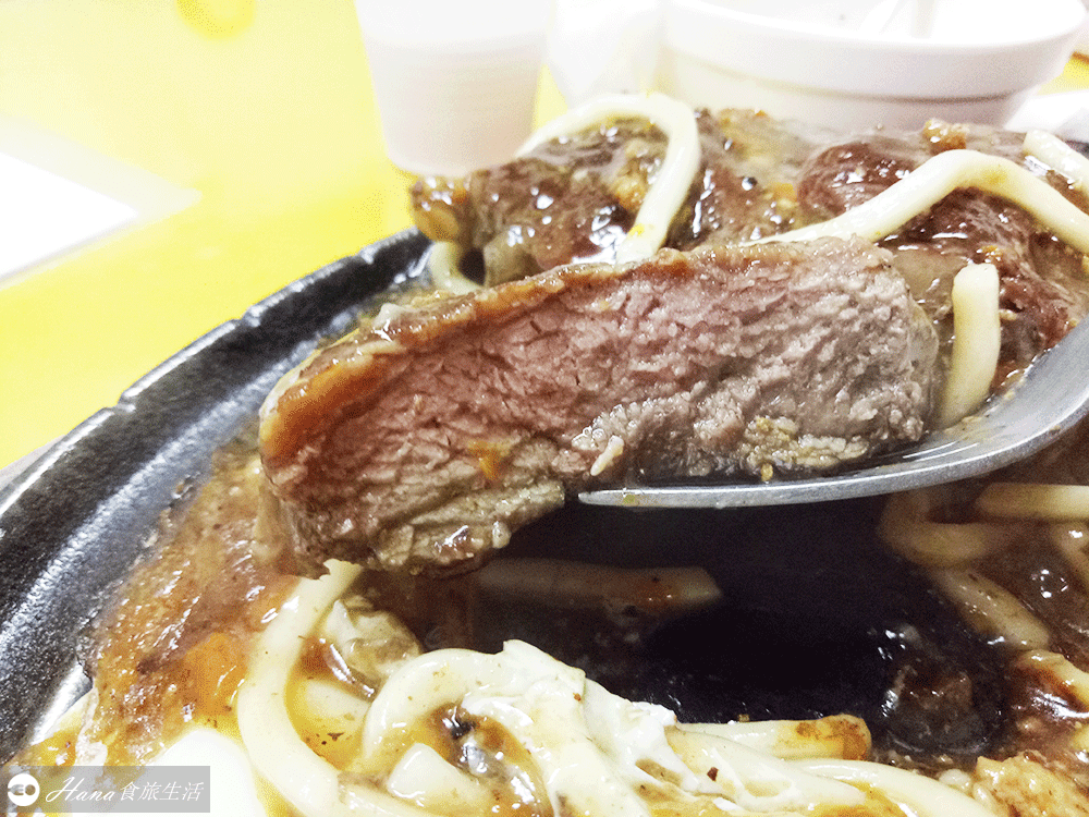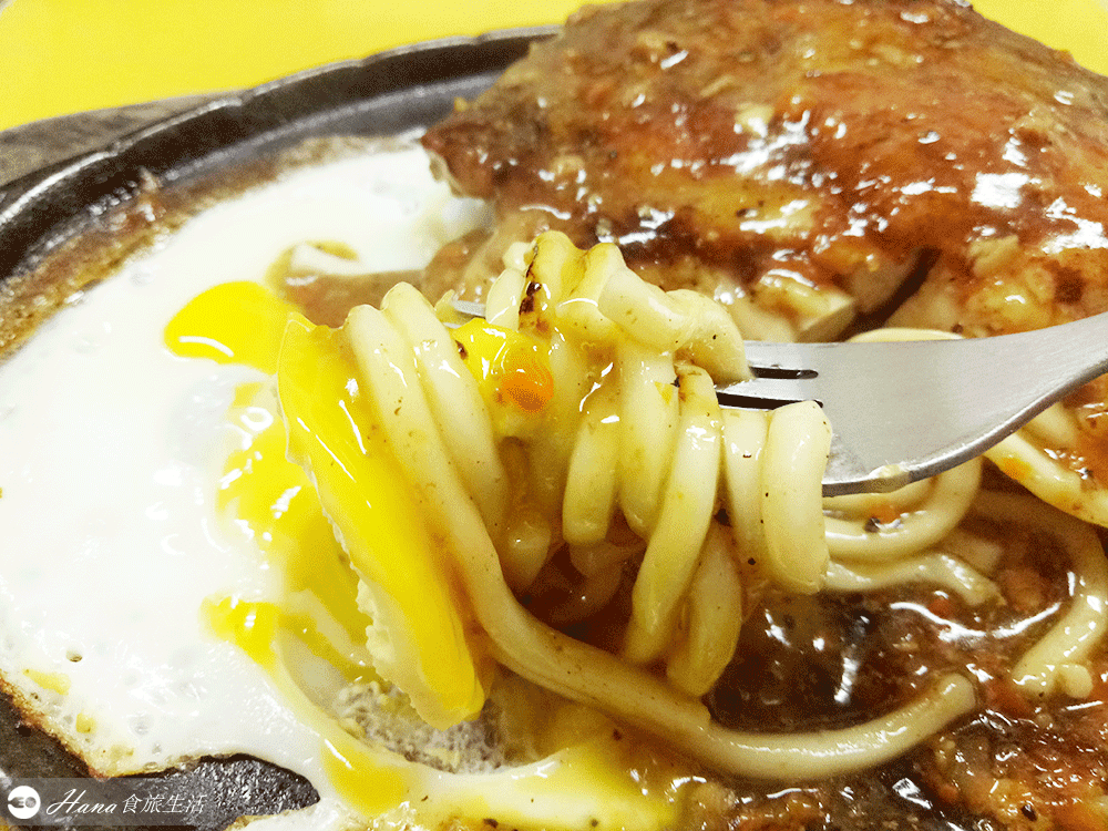 ▲吃平價牛排的例行事項就是把鐵板麵沾進半熟蛋黃液中~