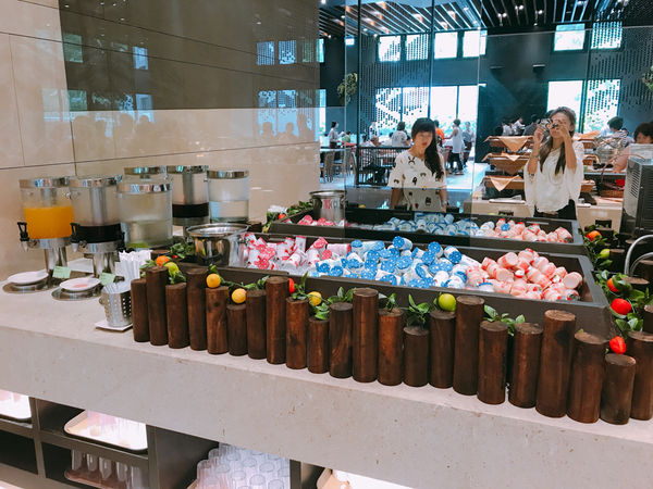 早餐種類好多,麵包、中式炒麵、米腸、照燒百頁豆腐、、培根、清蒸鮮露魚排、鴨賞、荷包蛋、香腸、、燒賣、紅燒獅子頭、炒蛋、雞塊、薯條、三星蔥油餅、小湯包等等