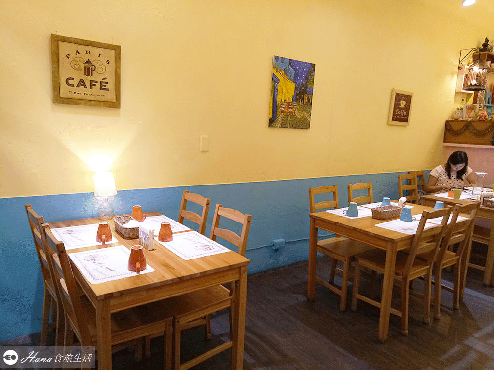 ▲很喜歡木製的桌椅和漆成黃色與藍色的牆面