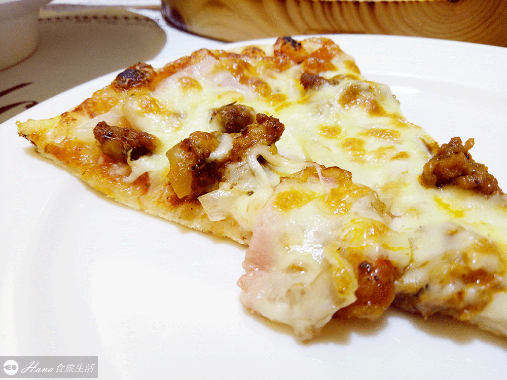 裡面的配料有洋蔥、美式香腸片、加拿大培根、特製義式肉醬,