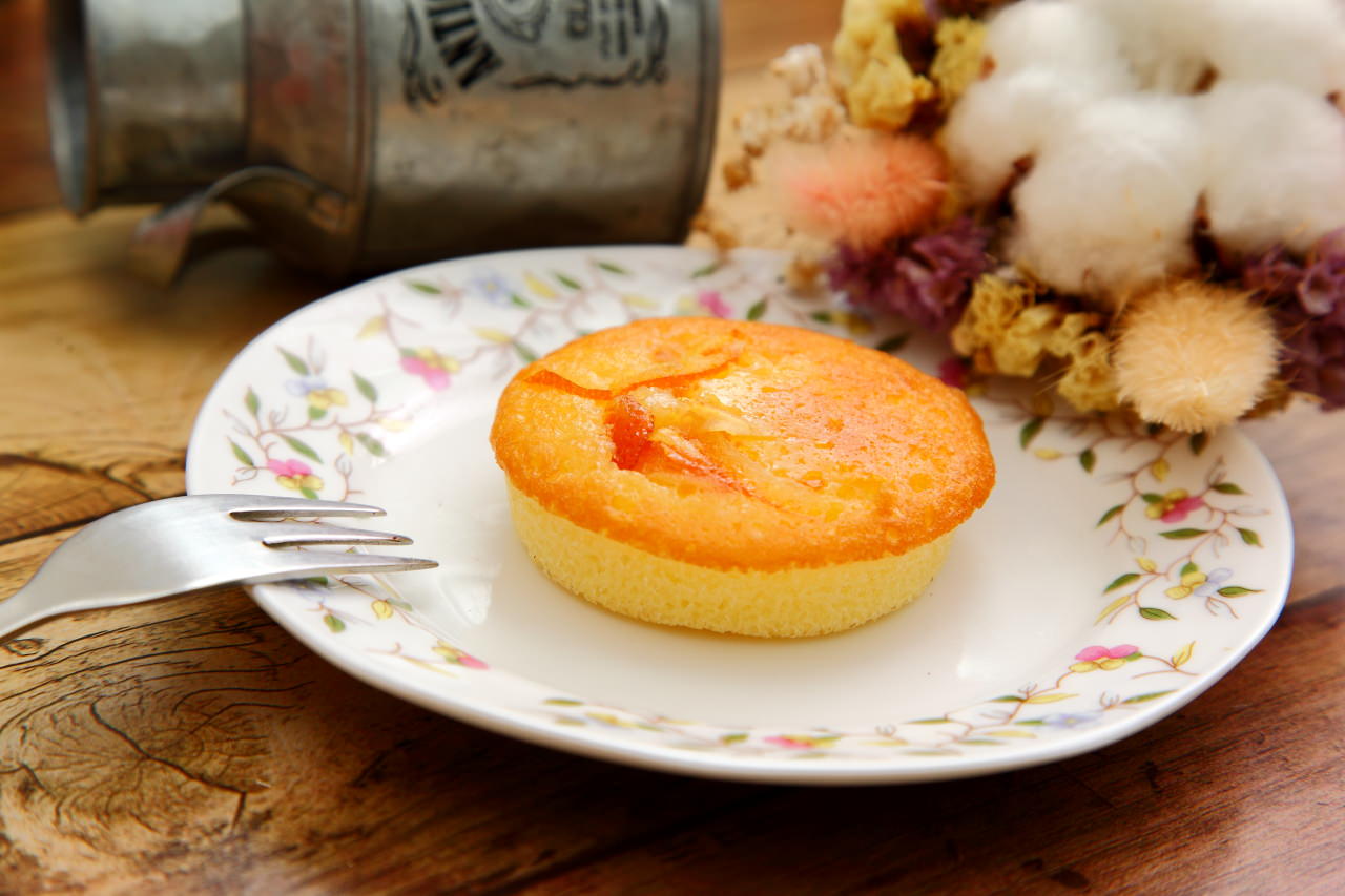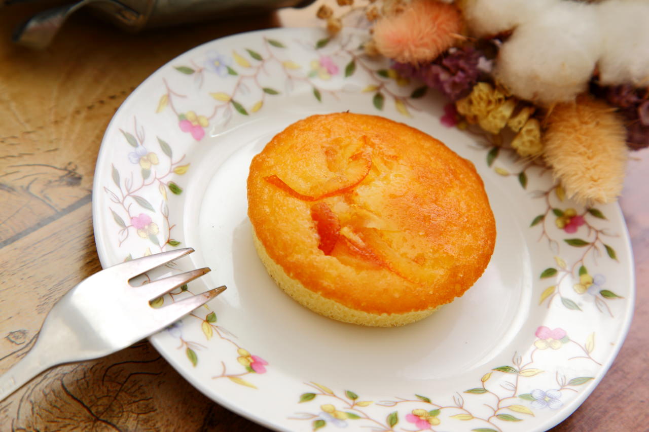 杏仁奶油蛋糕裡加入進口香橙酒及柳橙醬,上面再鋪上日本梅原橘皮絲,鬆軟蛋糕體裡有著醇香微酸的柳橙果香