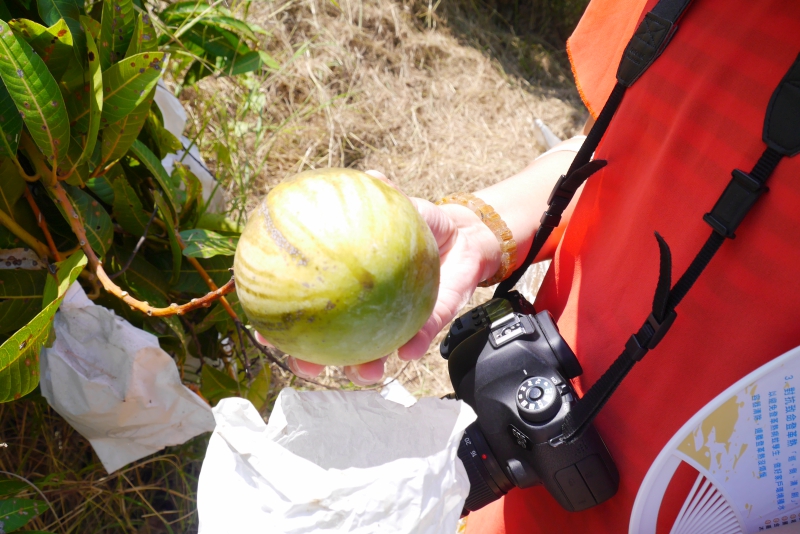炎炎夏日,在半山坡地挑芒果真的是一大考驗,摸到一顆感覺頗有重量就會打開來看,無損害,綠偏一點黃的情況下就可以直接轉兩下拔起來放袋子啦!