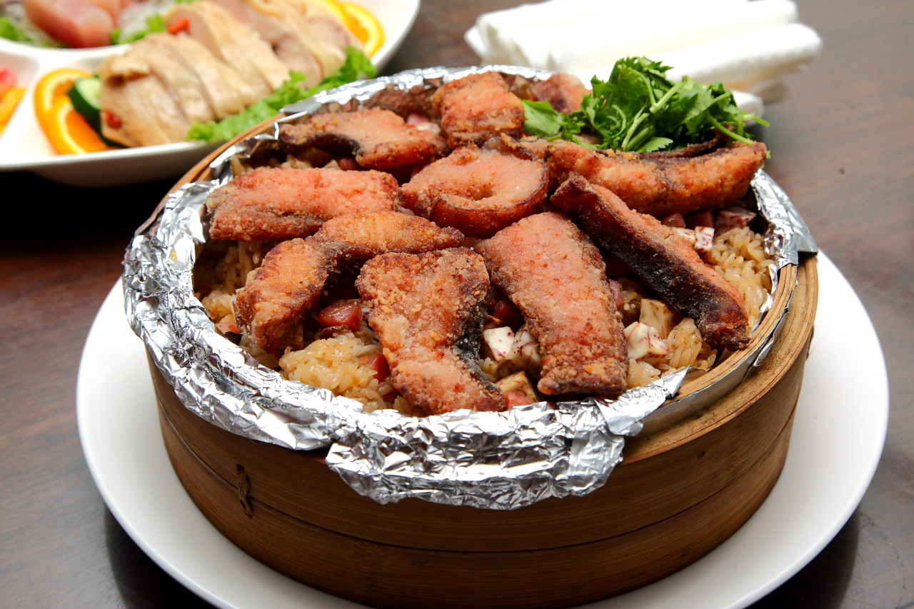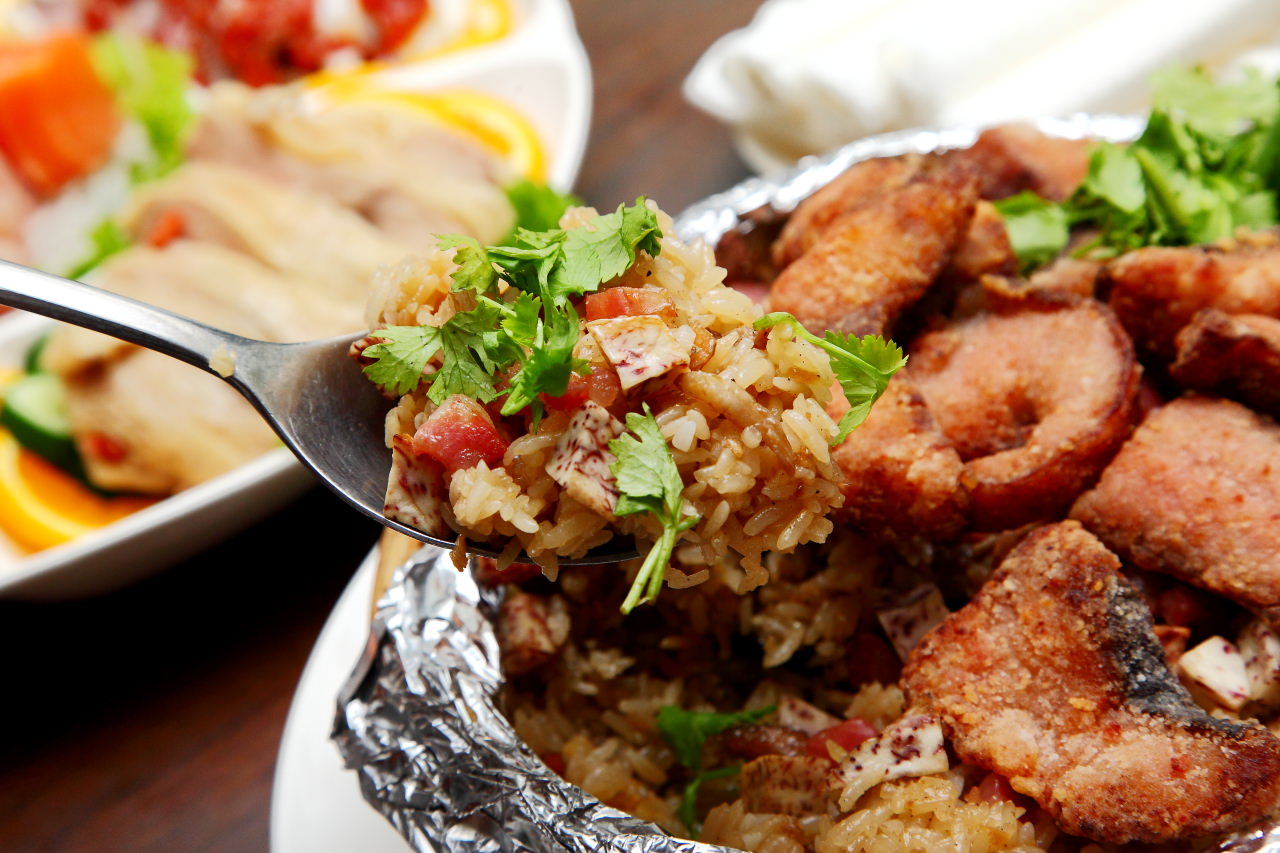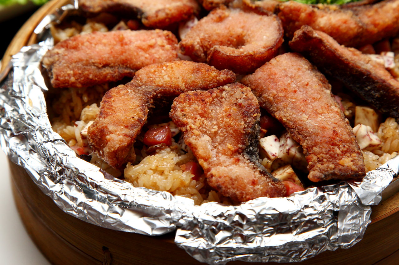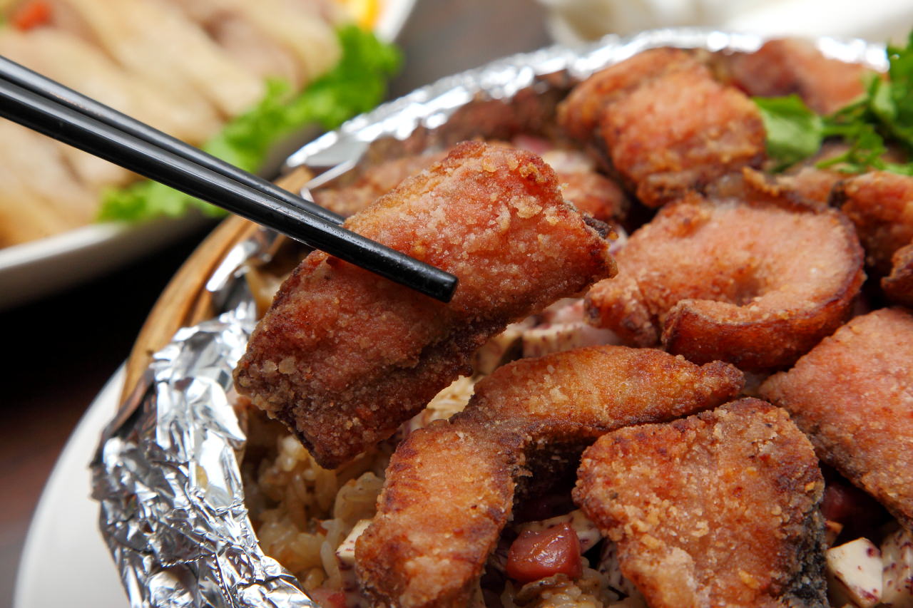 經過紅糟醃漬油炸的鰻魚,口感比起一般鰻魚要紮實許多,入口除了鰻魚細緻的肉質及甜味外,還有紅糟淡淡的甜香,搭配軟Q的糯米飯一起食用,口感相當富有層次,飯裡的香腸也是特別經過挑選,鹹香油潤,讓這米飯吃來不油膩也能夠入味!超讚!