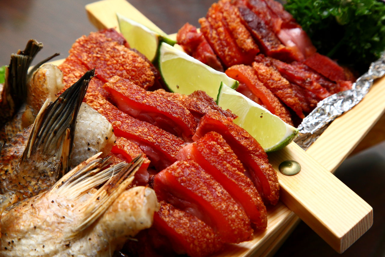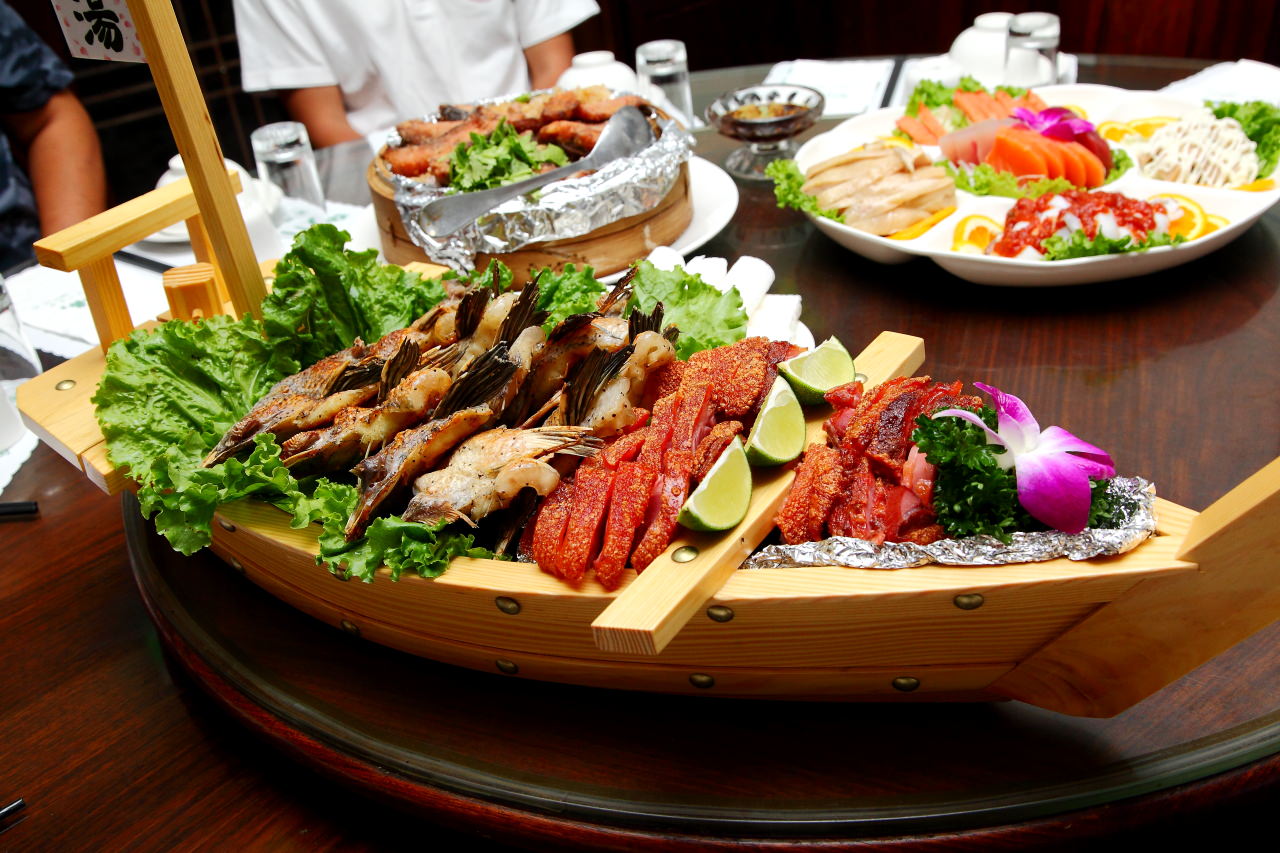 滿載而歸,顧名思義就是一艘船上滿載著山珍海味的佳餚,主廚在大船上放滿了鹽烤台灣鯛下巴及德國豬腳