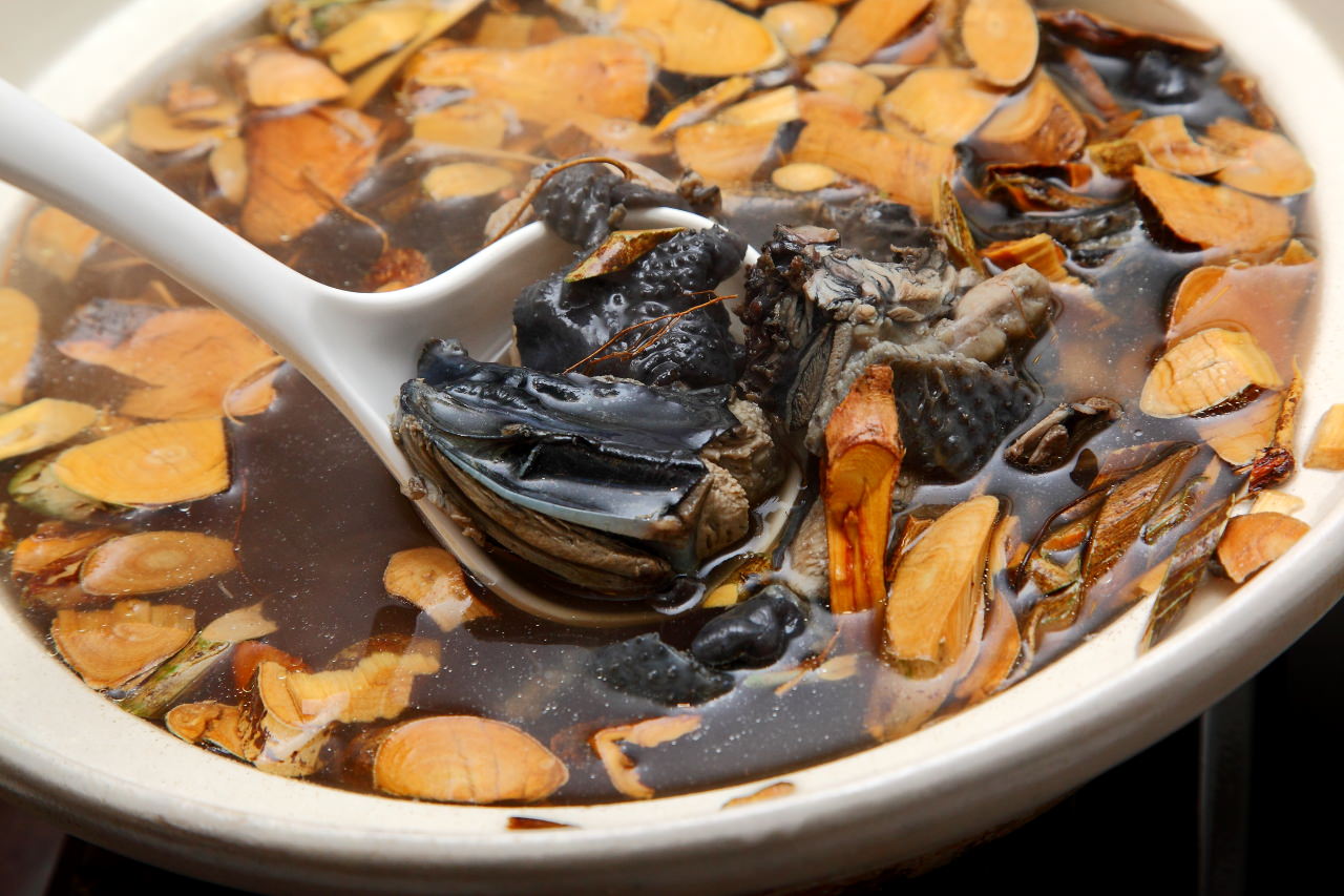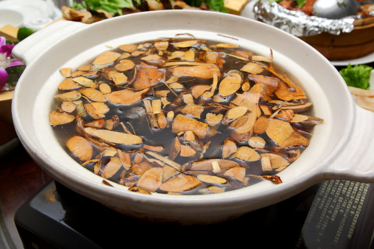 湯面上好像飄著木片一般的東西就是羊奶埔,川湯的羊奶埔還要經過用酒三年的浸泡熟成,用羊奶埔藥酒與烏骨雞一起燉,熱熱喝一口,一股溫暖的氣息熱湯下肚,舒服!湯頭清爽甘甜,這雞湯真的很好喝,最厲害的就是說不出這湯他哪裡好喝,但就是忍不住要去多盛一碗再一碗