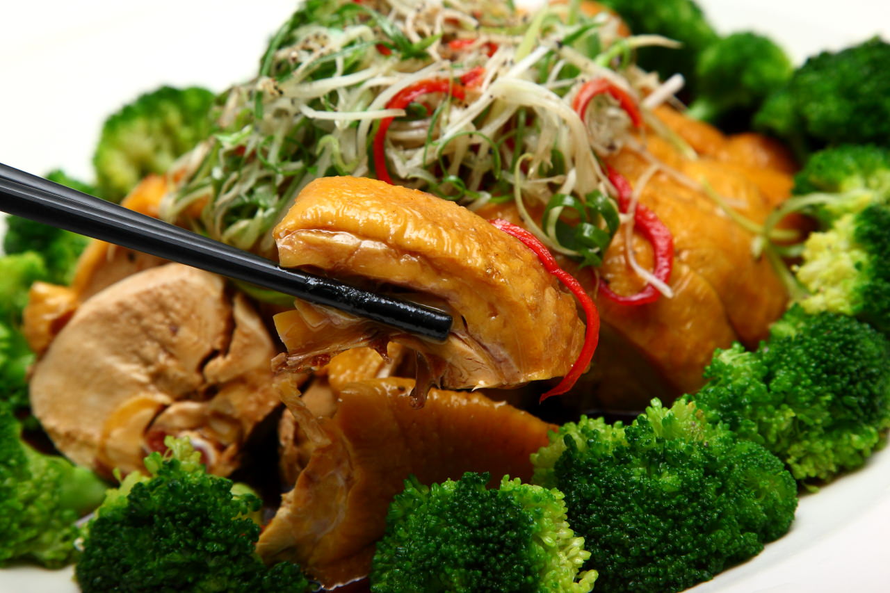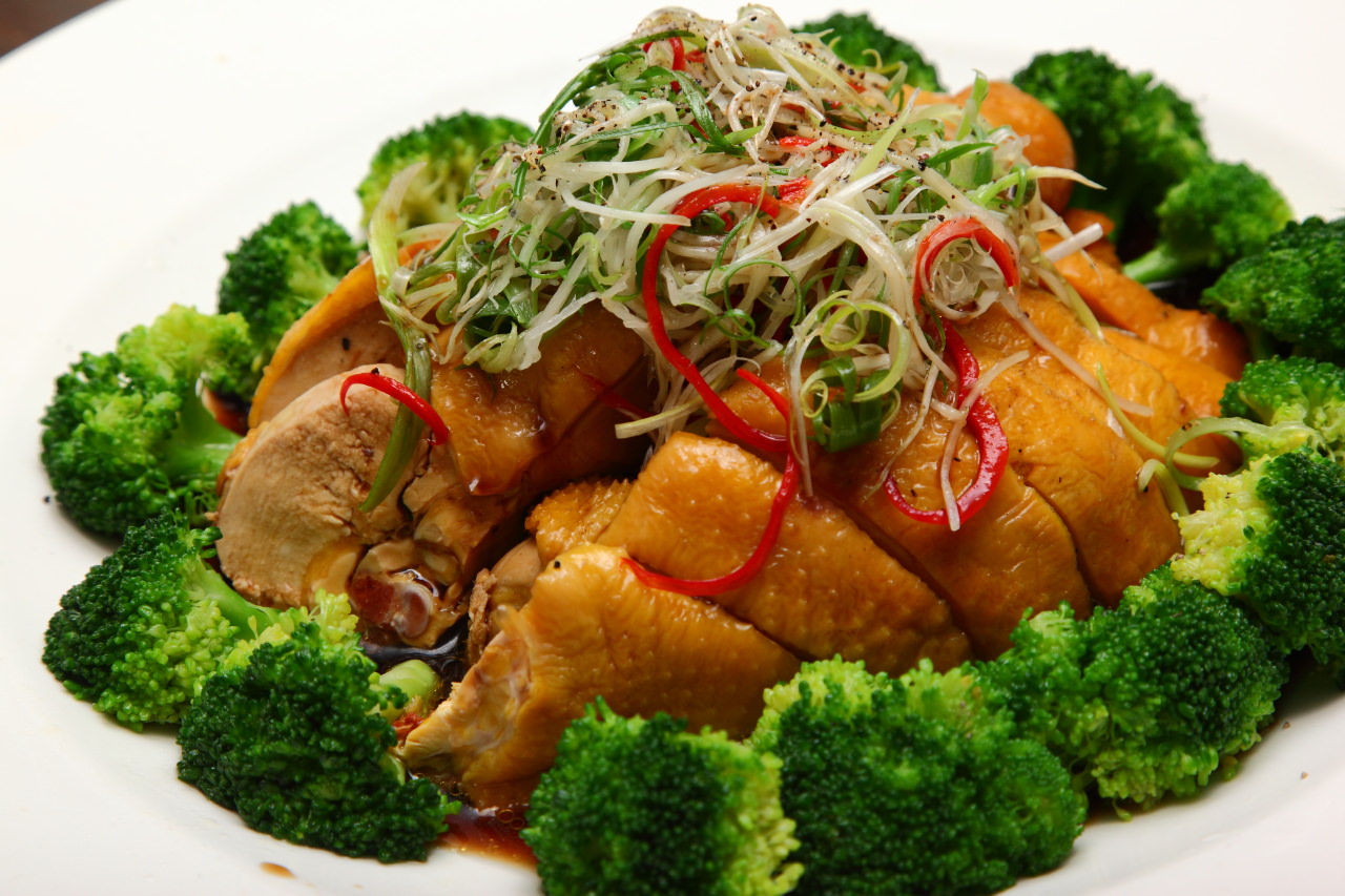 文昌雞,又名蔡氏雞,是廣東八大優良雞種之一,皮薄肉嫩,主廚與蔥油搭配,咬咬第一次吃文昌雞,這雞皮色黃且薄跟一般的雞完全不一樣