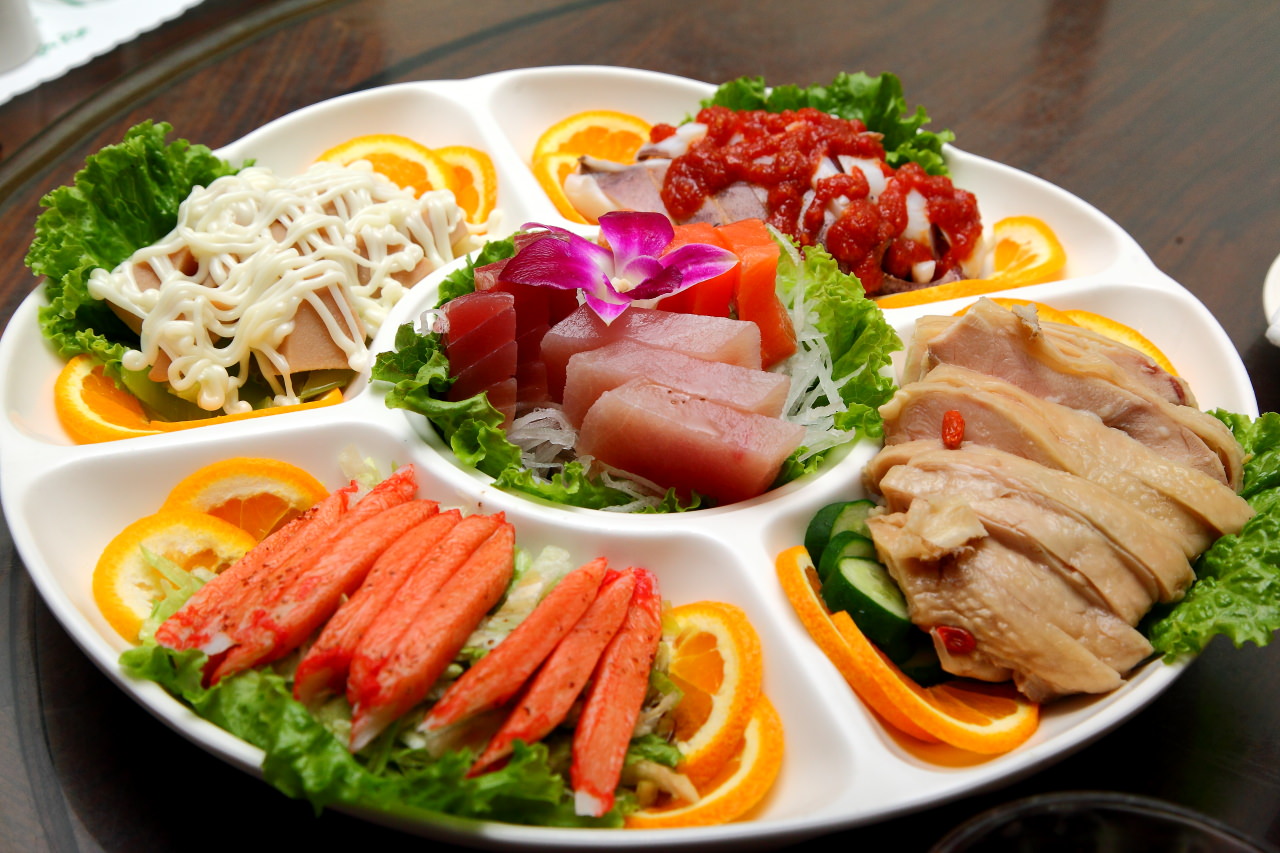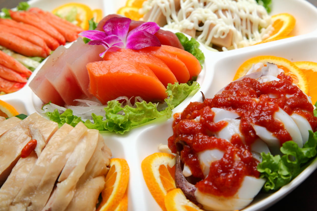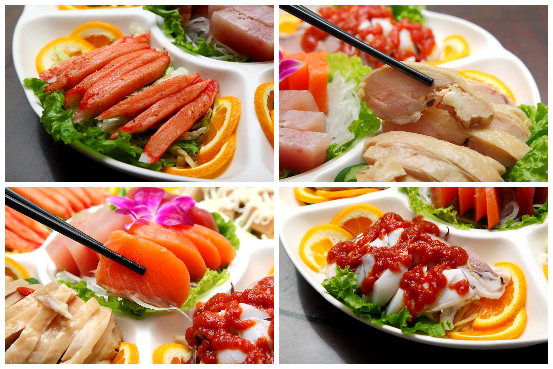 山珍海味大集合!三品生魚片、沙拉鮑魚、五味花枝、油雞、蟹肉棒