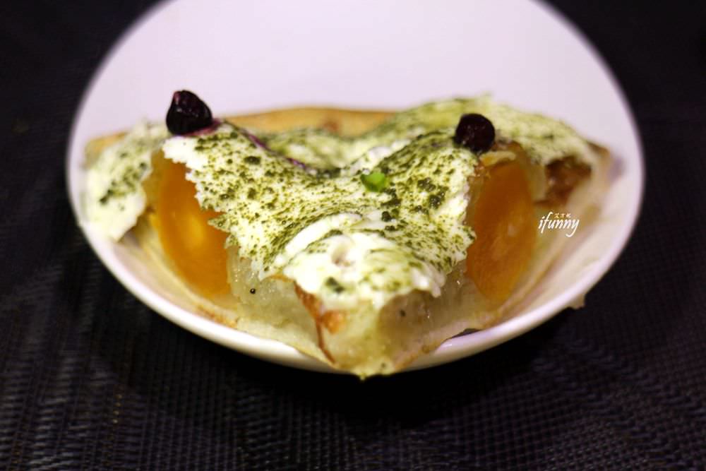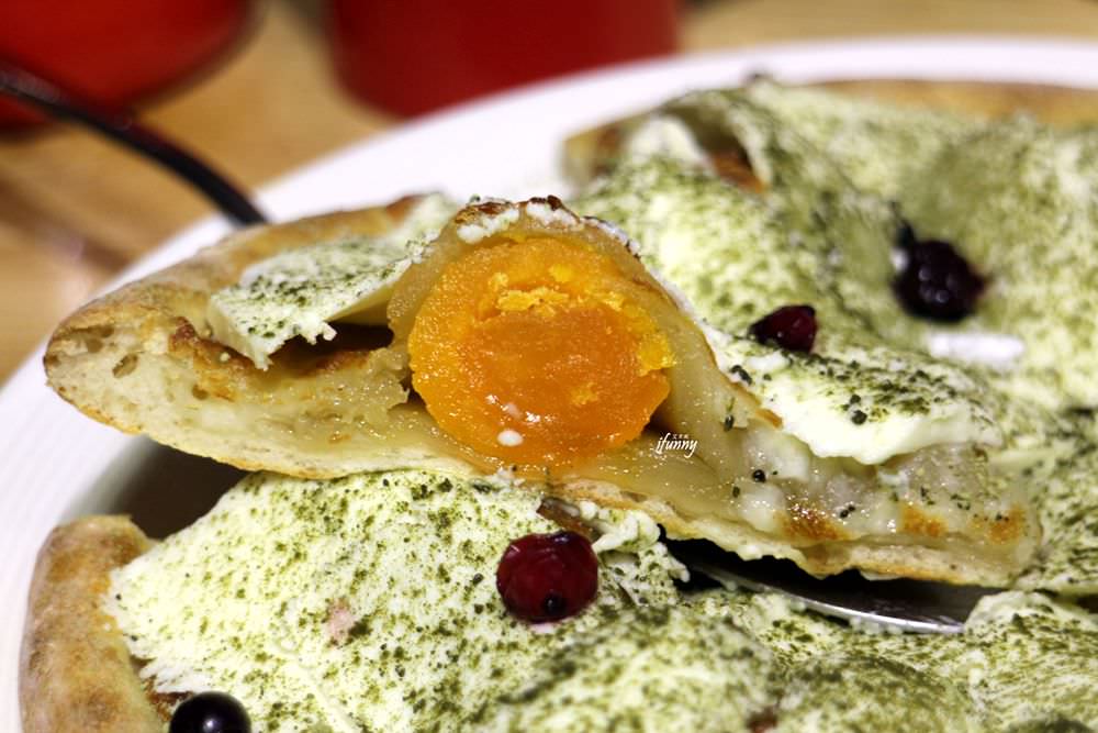 一個六吋的披薩放了六顆大顆又飽滿的鹹蛋黃,切成六等份後,一片都可以吃個一整顆蛋黃,超滿足的!烏豆沙舖了一整層在鮮奶油底下,自家炒的烏豆沙香甜卻不膩口,加上冰凍的鮮奶油,還帶著Q勁的披薩餅皮一起入口,這披薩帶著冰涼又十分清爽,裡頭的每個食材:麵粉、蛋黃、烏豆沙及鮮奶油,每個又很搶戲卻很協調地演出,這也太好吃了吧!!