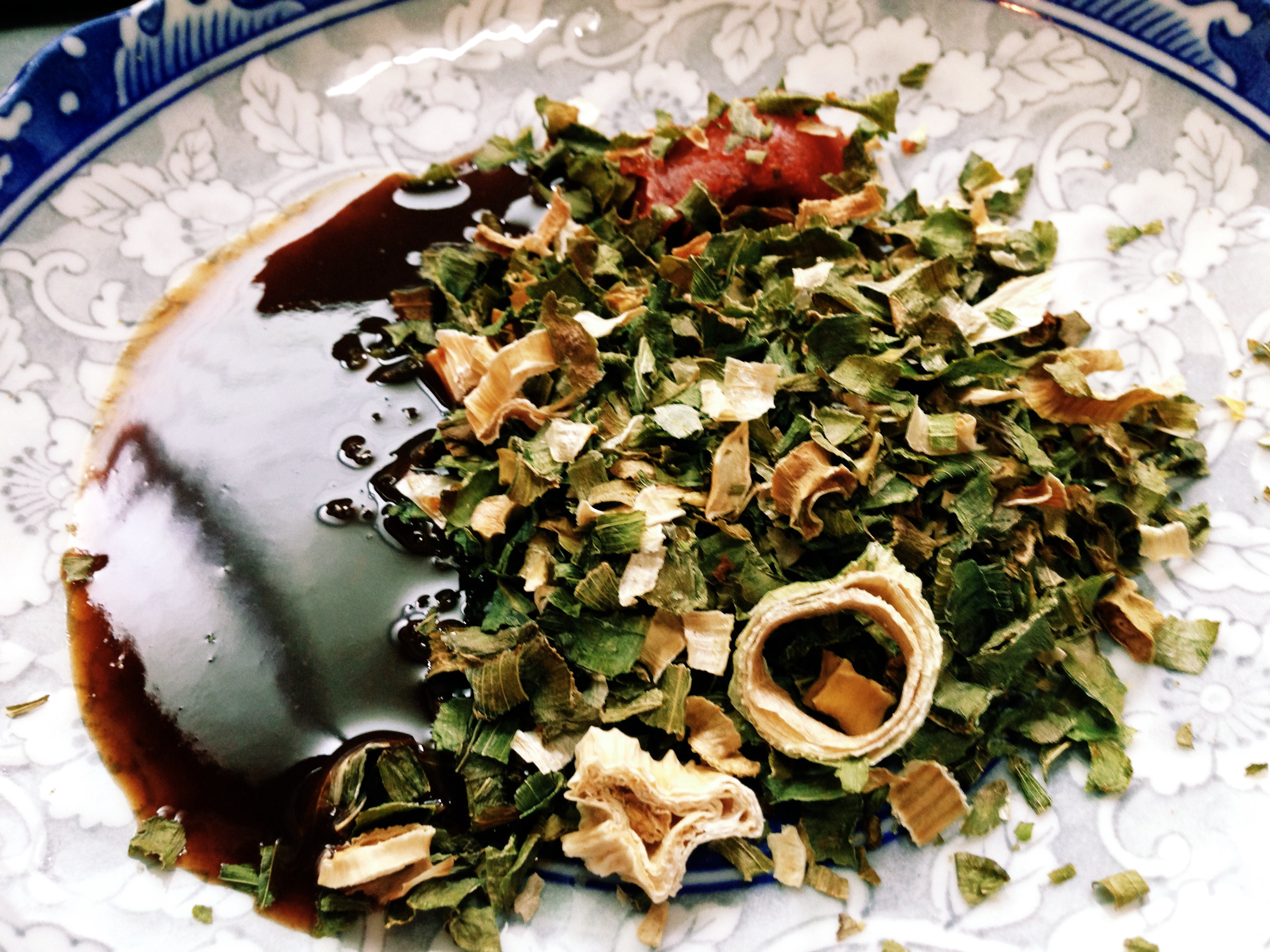 但因為蔥狀態是屬於乾燥的狀態,需要一瓢熱水給他簡單的燙開,這樣才能讓蔥的香氣放出來