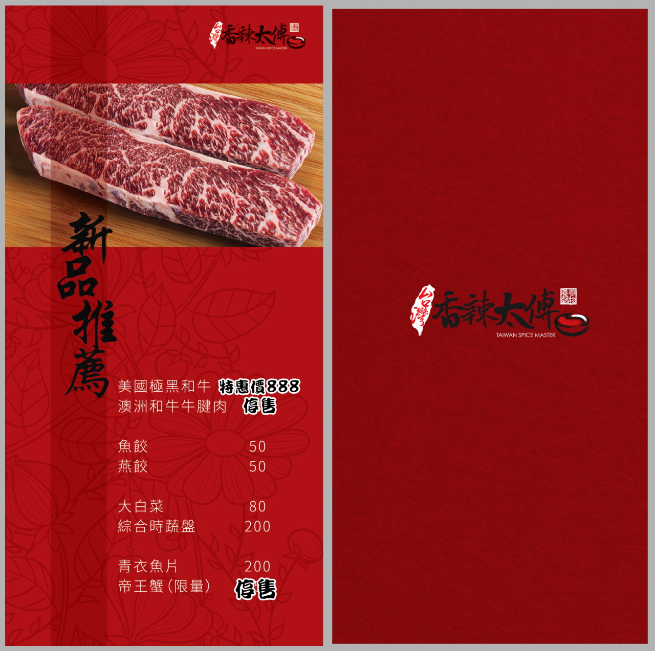 台灣香辣太傅的菜單,大紅色喜氣洋洋! 台灣香辣太傅是消費採單點式,但價位跟別加單點麻辣鍋相比實在是有夠超值的,鍋底費每人只要110元,招待小菜、熱茶、冰棒、鴨血&豆腐無限續加,一人低消也只要三百大洋,肉類單品220~400之間,其他單品火鍋料等也在百元左右,不定時還有新品優惠推出,目前是頂級美國極黑和牛原價1088現在只要888!四個人點下來大約五百元就可以吃的超飽,比吃吃到飽還划算呢!