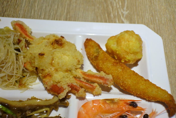 有炸柳葉魚、炸花枝丸和炸螃蟹.