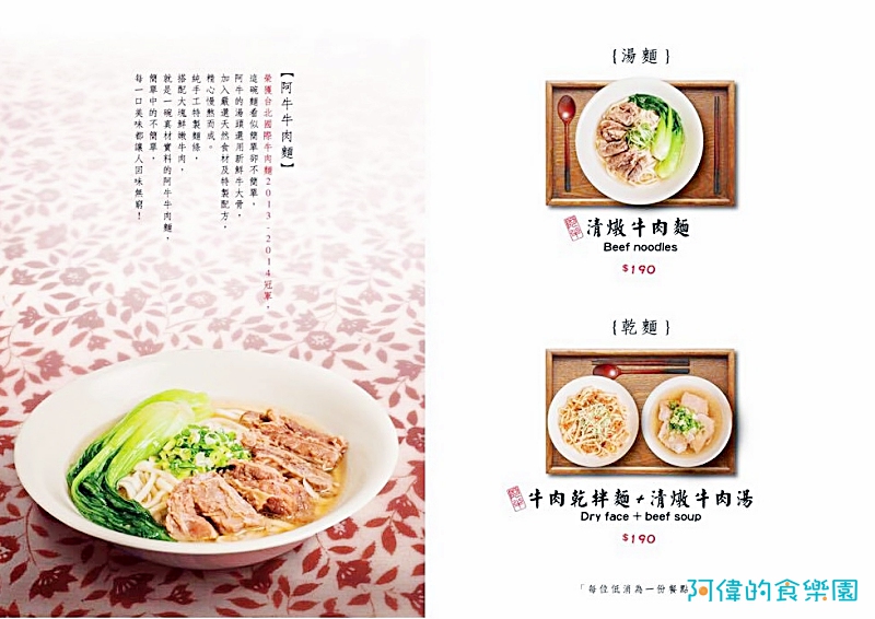 一種是清燉牛肉麵(奪冠作品)、另一種是牛肉乾拌麵+清燉牛肉湯,價格都是NT$.190(無服務費)