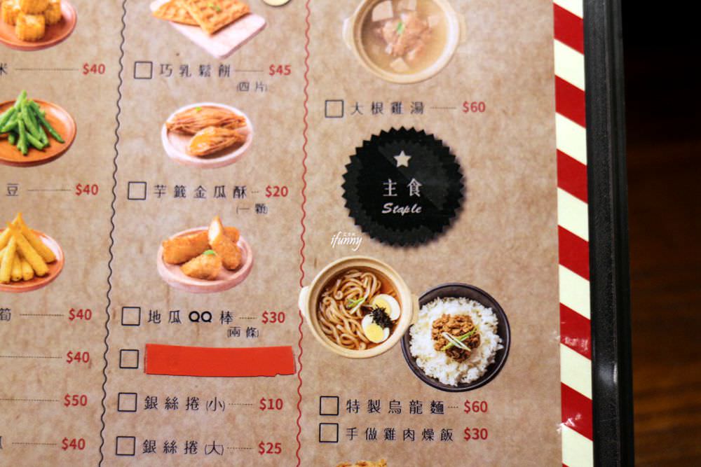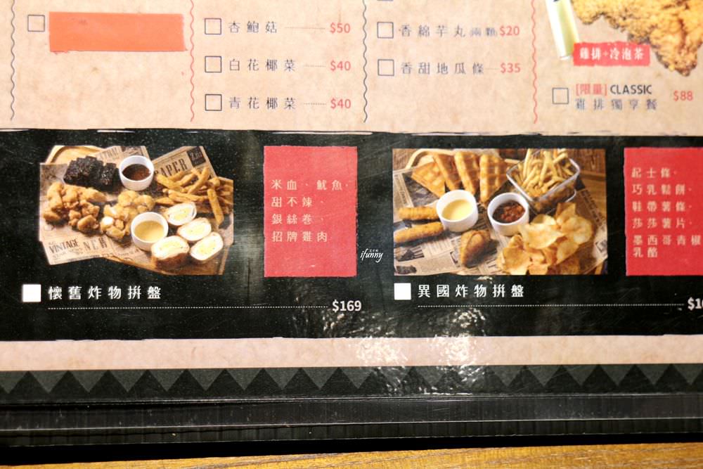 可以想像這竟是鹹酥雞的菜單嗎?太多品項了吧!而且還依照食材的特性做出了分類,這令人在選擇時可以少些煩惱。但這幾乎是銅板價的餐點,令人就是每個分類都想點來嚐嚐看啊!