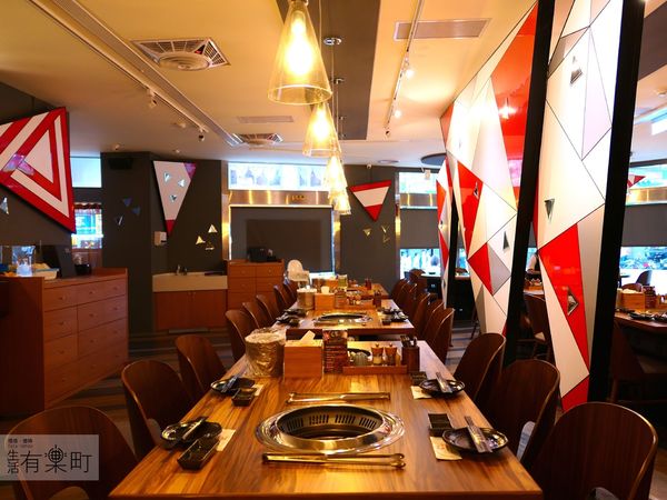 除了裝潢十分新穎以外,店內空間寬敞,座位配置得宜,還運用三角形狀的鏡面圖騰裝飾,帶出了日式輕時尚感,多層次色彩的搭配設計極為搶眼,原來燒肉店也能如此有藝術感。