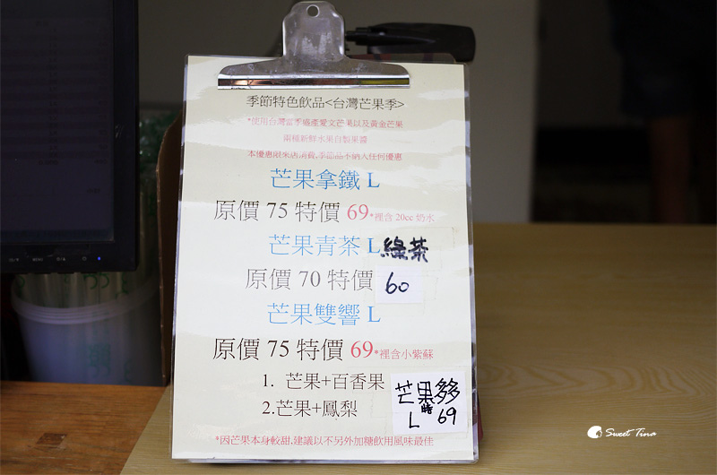 除了些固定的飲品外,店家也會隨季節推出特色飲品,目前提供的就是芒果相關的飲品。