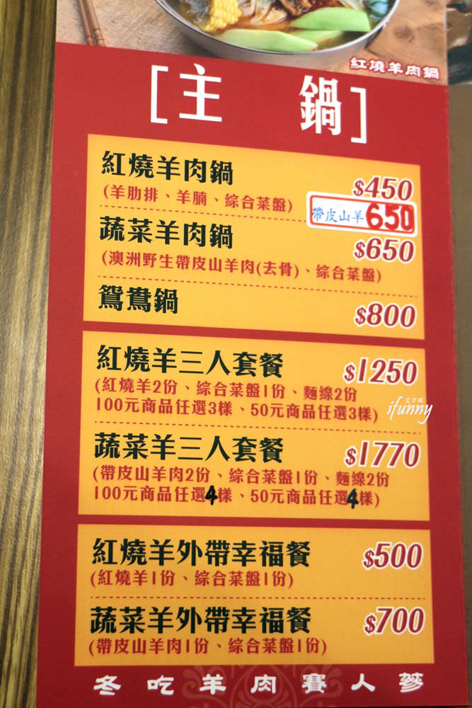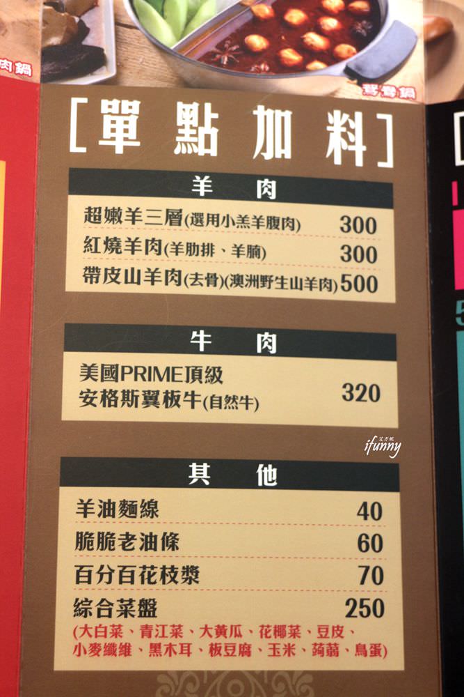 吃羊肉爐也有鴛鴦鍋可選,就是紅燒羊及蔬菜羊。之前艾方妮曾嚐過蔬菜羊,這天就改選紅燒羊囉!紅燒羊中的羊肉是以羊腩及羊肋排為主,最近推出帶皮羊肉的紅燒鍋底,喜愛帶皮羊肉的朋友別錯過了!