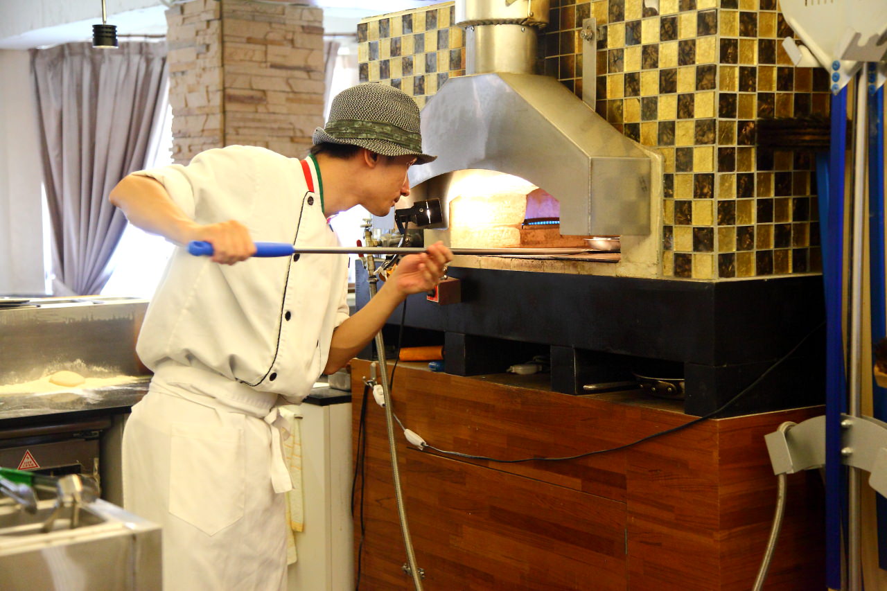 開放式的廚房,廚師正在忙碌著準備料理,全台首創雙石窯烤爐,在用餐之餘也能窺見廚師們不管是做披薩、烤肉,飛快的處理各種食材送入窯爐,再出來就是令人讚嘆激賞的美味創意料理!