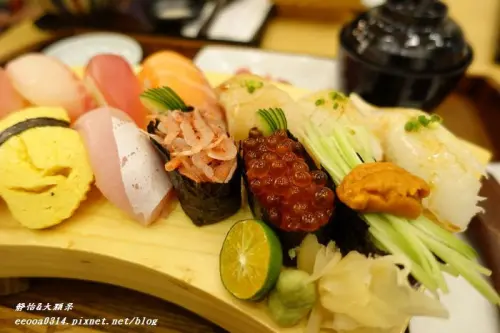除了姬鯛、鮭魚、紅甘等多種新鮮魚類之外 還放了魚卵、玉子燒、蔥花及海苔絲