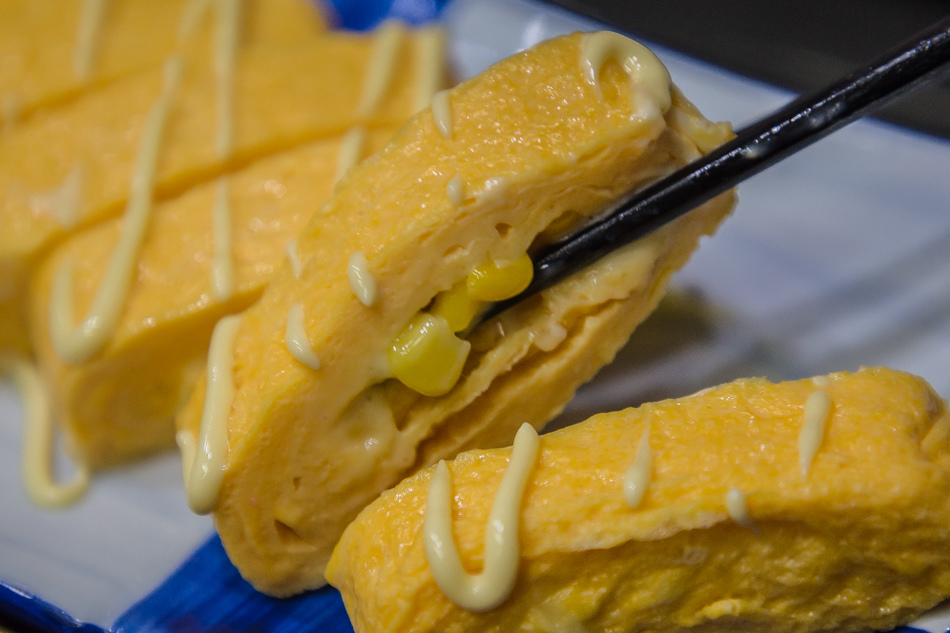 ▲先上桌的是起司玉米玉子燒,玉子燒有多種口味,原味、明太子、起司、玉米。