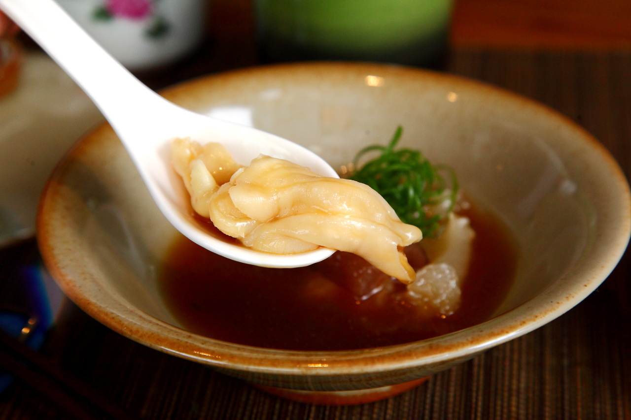 但!別小看這一小碟!裡面可是有養身三寶:烏參、蹄筋、鴨掌,然後用主廚秘製蠔油下去悶煮,食材特性皆不同,要怎麼拿捏炊煮時間的分寸這就是主廚的實力了,蠔油的鹹甜濃郁的香氣都融入食材之中,連最難入味的烏參照樣燉煮入味,吃起來軟Q有彈性