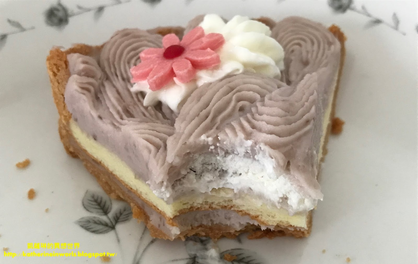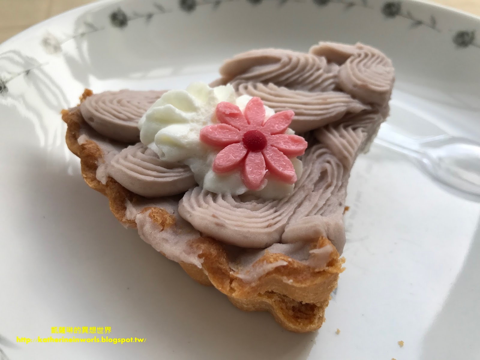香酥塔皮上有著淡淡的紫色花瓣綻放,是純芋泥融入北海道奶霜的原色,口感輕盈。接著是香醇濃郁帶有顆粒的芋泥餡、奶霜與泡芙蛋糕,豐富的層次讓人一口接著一口。