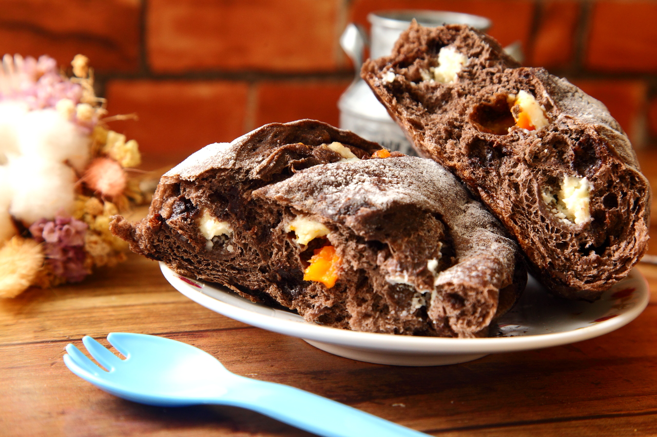 內餡超豪華!加入許多芒果乾跟乳酪,芒果的甜香及乳酪的溫潤濃郁乳香口感,跟苦甜巧克力麵包簡直絕配!