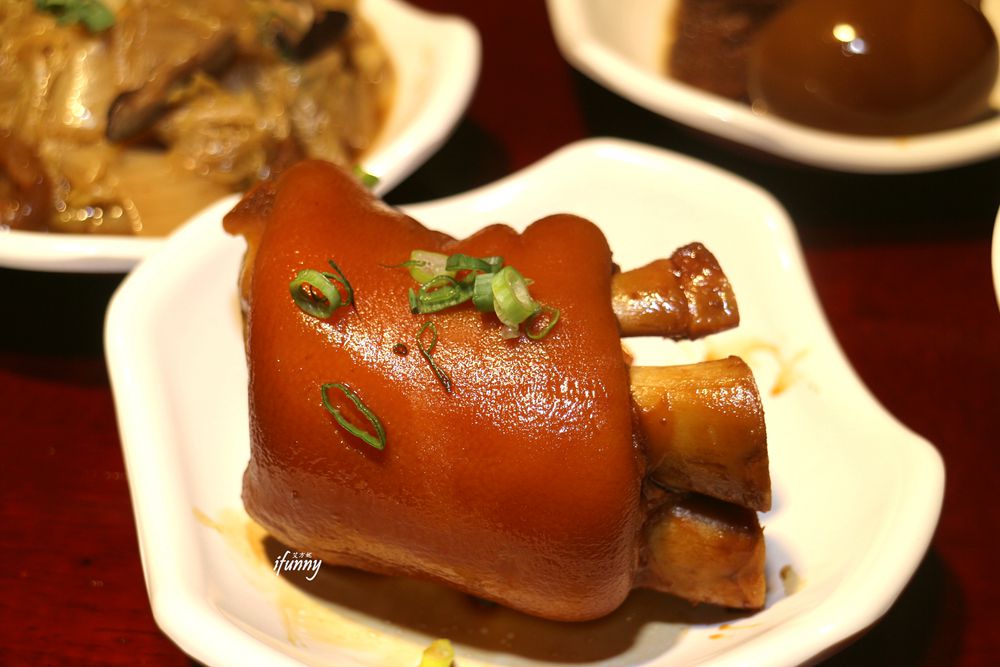 一般豬腳有腿庫、腳蹄,而這中段豬腳是店家經過多次實驗後,決定只賣這個部位。而這豬腳皮經由長時間燉煮,怎麼會保有這麼美麗的外觀?豬腳皮閃閃發光,難不成還沒燉煮到位嗎?還有那一點黑色的豬毛都沒看到,這可見店家事先在處理豬腳時就已經很費心思了!