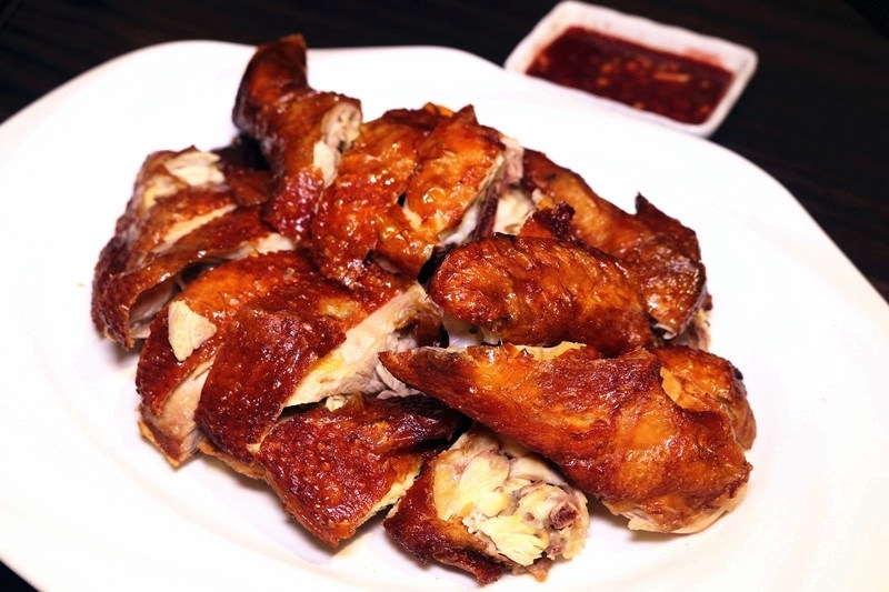 一整隻雞以紅麴醃製,