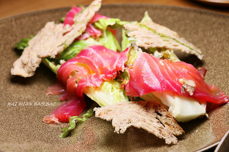 上面擺著冷燻鮭魚片、核桃麵包薄片、培根碎片