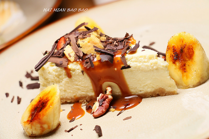 重乳酪蛋糕灑上巧克力,旁邊以香蕉裝飾