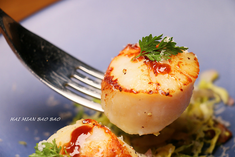 干貝外表煎成金黃,裡面還是半熟的軟嫩